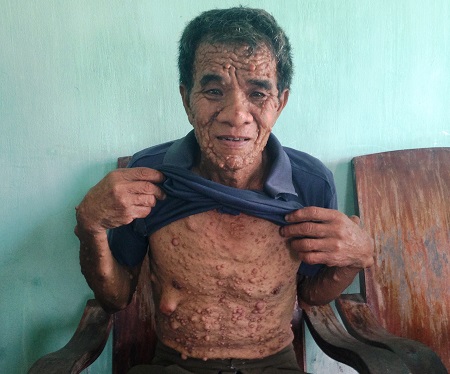 Đó là tình cảnh của ông Nguyễn Văn Đề, 59 tuổi, thôn Tiêu Sơn, xã Thanh Giang (huyện Thanh Miện, Hải Dương). 26 năm nay, cơ thể của ông dày đặc những mụn thịt như khối u. Ban đầu nó chỉ lấm tấm trên da thịt, dần dà thì to, mọng như chỉ chực vỡ ra.