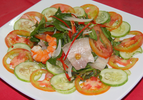 - Thịt ba rọi luộc chín, thái lát mỏng. Tôm luộc chín, bóc vỏ. Cà chua, dưa leo thái lát mỏng. Hành tây, ớt thái sợi.