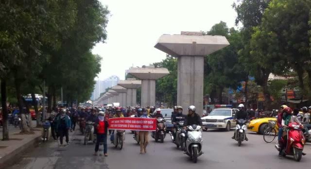 Vừa kịp ăn xong, tất cả 1500 con người từ Văn Giang, Dương Nội, Bình Thuận, Vũng Tàu, Đắc Nông, Thái Bình, Hà Nội, Tây Bắc v.v lại tiếp tục tràn xuống lòng đường biểu tình la lối, dâng cao khẩu hiệu, biểu ngữ. Khiến cả chặng dài từ bến xe Hà Đông, Quang Trung, Trần Phú, Nguyễn Trãi, Ngã tư Sở, tắc nghẽn ...Công an dù đã mật báo xin chỉ thị từ cấp trên, điều thêm quân, cả áo vàng, áo xám, xe tù, xe cứu thương dùi cui, còng số 8 v.v nhưng giữa đường, giữa chợ, sợ thế giới nhìn thấy, bà con Hà Nội, Hà Đông trông vào nên chỉ lùi lũi theo đuôi ,đầy hậm hực, bực dọc, như những con chó giái ...