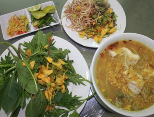 Các loại rau ăn kèm: Hoa chuối thái sợi, rau răm, diếp cá, xà lách, húng láng.