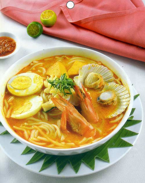- Cho bún và giá trụng nóng vào tô, sắp lần lượt tôm, mực, đậu hũ, sò điệp, trứng gà lên, múc nước súp vào, rắc rau răm xắt sợi lên trên. Dùng nóng.