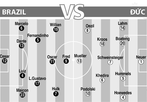 - Ở lần gặp nhau gần nhất giữa hai đội trong năm 2011, Đức thắng 3-2 với các bàn thắng của Schweinsteiger, Schuerrle và Goetze - 3 cầu thủ đều có thể ra sân đêm nay. Trong khi hai cầu thủ ghi bàn cho Brazil là Robinho (không được gọi) và Neymar (chấn thương) đều không thể tham dự.