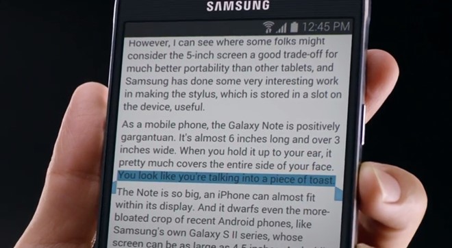 Samsung trích dẫn lại một bài báo của tờ The Wall Street Journal từng cho rằng việc sử dụng Galaxy Note "giống như bạn đang nói chuyện vào một lát bánh mì nướng". Buồn cười là việc nói chuyện với "những mẩu bánh mì nướng" đó đã trở thành một xu hướng của thị trường di động hiện nay. Và kích thước màn hình trung bình của dòng điện thoại này là 5 inch.