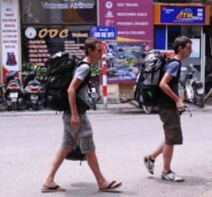 Hai khách du lịch nước ngoài đi ngang một Công ty du lịch ở Hà Nội hôm 04/8/2010. Ảnh minh họa./AFP photo