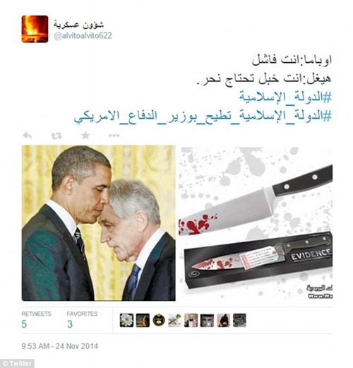 "IS đã lật đổ Bộ trưởng Quốc phòng Mỹ", IS cho biết trong tuyên bố trên Twitter kèm ảnh minh họa photoshop cảnh chặt đầu ông Hagel và ảnh chế Tổng thống Barack Obama đá ông chủ Lầu Năm Góc.