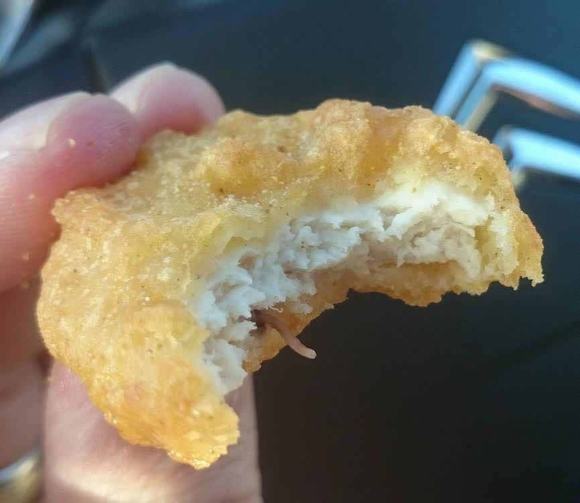 Nikki Sanders (30 tuổi, người Anh) cho biết con gái mình đã từ chối ăn miếng thịt gà McDonal được mua tại siêu thị và cô đã ăn thử. Thật kinh hãi khi vừa cắn một miếng Nikki đã phát hiện món đồ ăn nhanh này có vật thể lạ gần giống với sâu đang lơ lửng bên trong đó.