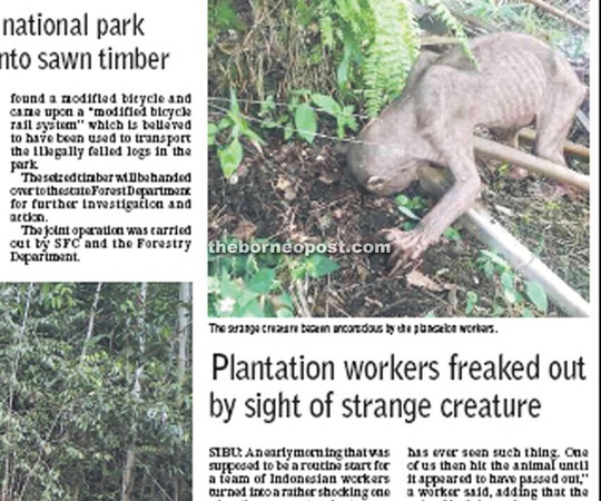 Sự việc xảy ra ngày 30/1 tại đồn điền cọ dầu ở Sarawak (Malaysia), khi một nhóm công nhân nhân Indonesia nhìn thấy một con thú lạ có ngoại hình kỳ dị: da màu nâu xám, lỗ tai ngắn, 4 chân, móng sắc nhọn nhưng không có đuôi.