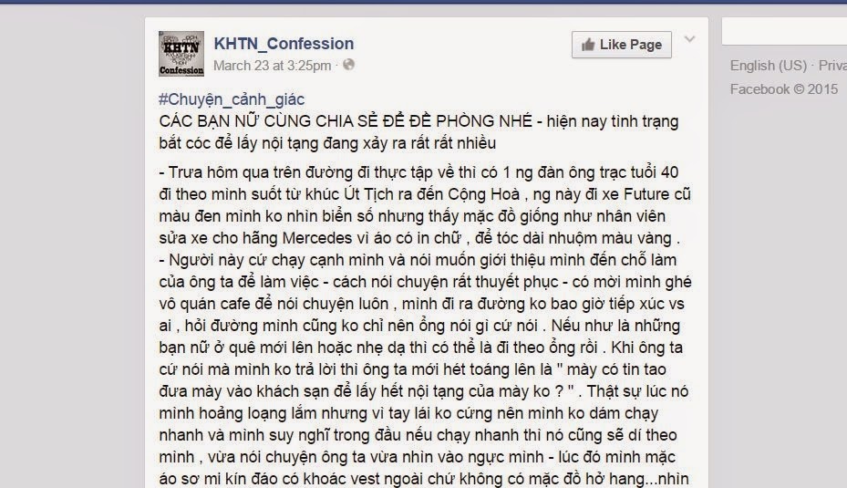 Đồng thời trong thời gian này, cộng đồng facebook có thành viên bỗng lên mạng cảnh báo về một người lạ chuyên gạ gẫm và hù dọa “đưa vào khách sạn mổ hết nội tạng” trên tuyến đường Cộng Ḥa.