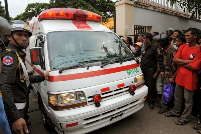 Cảnh sát quân đội Campuchia ổn định trật tự cho xe cứu thương đi qua đám đông trước cổng một bệnh viện ở Phnom Penh vào ngày 23/11,2010. Một bệnh viện quân đội của Campuchia đă bị phát giác việc vận hành đường dây buôn bán nội tạng với sự tham gia của bác sĩ Trung Quốc. (Tang Chhin Sothy / AFP / Getty Images).