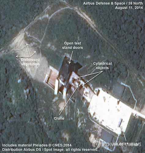 Hình ảnh vệ tinh về bãi phóng tên lửa Sohae của Triều Tiên, cho thấy Bình Nhưỡng đã tiến hành một cuộc thử nghiệm động cơ của tên lửa đạn đạo liên lục địa KN-08 vào giữa tháng 8/2014. Ảnh: Yonhap