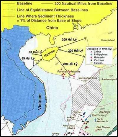 Đảo Hải Nam của Trung Quốc nằm rất gần đất liền của Việt Nam, chiếm 2,2 triệu km2 hải phận kinh tế, tức gấp 6,6 lần diện tích đất liền của Việt Nam (331.698 km2), gấp 4 lần hải phận kinh tế của Việt Nam.