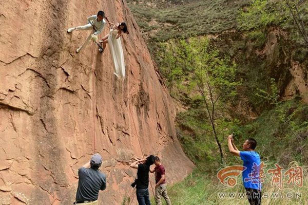 Một đôi trẻ Trung Quốc muốn có những hình ảnh cưới độc nhất vô nhị nên đã mạo hiểm cả tính mạng. Để thực hiện ý tưởng bộ ảnh cưới độc đáo, cặp vợ chồng này đã phải trèo lên vách núi đá dựng đứng để pose hình. Những hình ảnh dưới đây cho thấy cặp đôi này đã chấp nhận mạo hiểm như thế nào