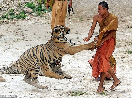 Nhà sư trụ tŕ chùa Wat Pha Luang Ta Bua vừa bị một con hổ cho chính tay ḿnh huấn luyện tấn công bất ngờ làm găy tay, găy răng và chảy máu mặt. Đó chính một trong số 150 con hổ mà ông nuôi tại tỉnh Kanchanaburi Thái Lan, nơi nổi tiếng thu hút khách du lịch.