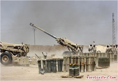 Pháo binh Iraq nã pháo về phía các tay súng IS từ vùng ngoại ô thị trấn Udaim – Ảnh: Reuters