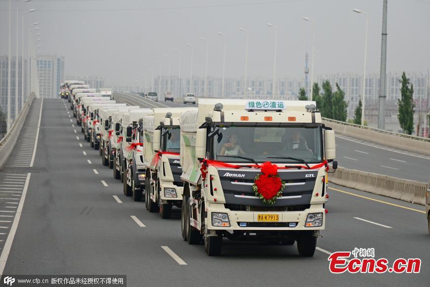 Ngày 27/6 vừa qua, trên đường phố tại thành phố Cáp Nhĩ Tân (Trung Quốc) đã diễn ra một lễ rước dâu đặc biệt ấn tượng. Trên đường xuất hiện một hàng dài 36 chiếc xe tải màu trắng xanh. Trên đầu mỗi xe đều được gắn hoa đỏ và chữ hỉ, biểu thị cho đoàn xe rước dâu.