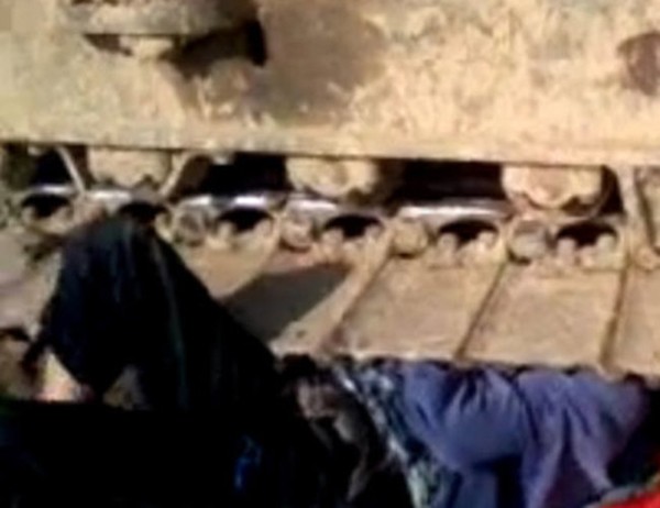 Theo hình ảnh ghi lại từ clip, một phụ nữ bị máy xúc chèn qua, một phần thân thể từ ngang ngực trở lên nằm gọn dưới bánh xích sắt. Nhiều người dân hoảng hốt ra ngăn cản máy xúc.