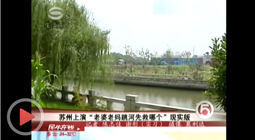 Vụ việc cười ra nước mắt vừa xảy ra tại thành phố Tô Châu, tỉnh Giang Tô, Trung Quốc. Mẹ chồng và nàng dâu hôm đó khẩu chiến ác liệt, chàng trai không thể can ngăn được họ. Vợ tức mẹ chồng lại không đươc chồng bênh liền nhảy xuống sông tự vẫn. Thấy thế, mẹ chồng cũng nhảy luôn xuống xem con trai cứu ai?