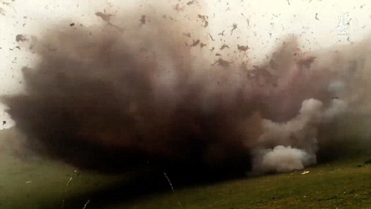 Kết thúc đoạn băng, bụi và mảnh quần áo bay mù mịt sau khi các trái bom chôn dưới đất phát nổ và tất cả 10 tù nhân đều không toàn thây.