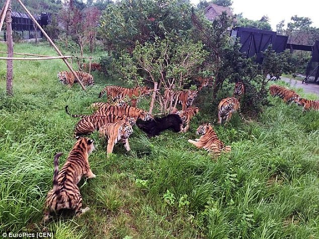 Những nhân viên và du khách có mặt ở công viên động vật hoang dã Thượng Hải, Trung Quốc hôm 10/8 đã vô cùng sợ hãi khi chứng kiến cảnh một chú gấu con bị 14 con hổ bao vây và cắn chết.