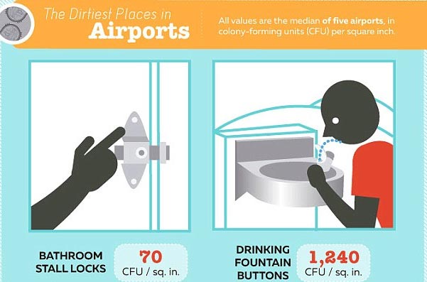 Ở các sân bay, những nơi dung chứa nhiều mầm bệnh nhất được kiểm tra là nút bấm hoặc chốt mở - tắt vòi nước rửa tay và chốt khóa phòng vệ sinh.