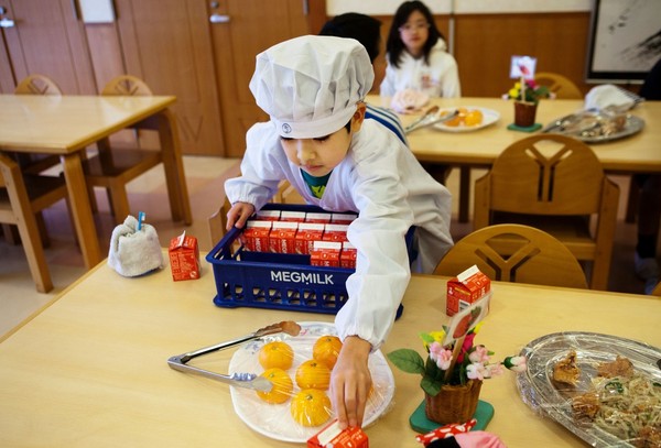 Bữa trưa tại trường học của trẻ em Nhật Bản là bữa ăn tự phục vụ. Chủ yếu các em sẽ cùng nhau dùng bữa trên chính lớp học của mình và tự phục vụ lẫn nhau. Mỗi ngày sẽ có một nhóm học sinh được phân công làm "anh nuôi" của cả lớp, có nhiệm vụ đi xuống bếp trường lấy thức ăn, bát đĩa lên cho cả lớp, sau đó chính nhóm này sẽ được "đứng quầy" phân phát thức ăn cho các bạn. Trẻ em Nhật được dạy tính kỷ luật ngay từ khi còn rất nhỏ, chúng được bố mẹ giáo dục phải tự biết ơn cuộc đời, chấp nhận thức ăn mà mình được ban phát. Cũng chính vì thế, rất hiếm có chuyện các cô giáo phải đi dỗ dành, van nài học sinh ăn cho đủ bữa.