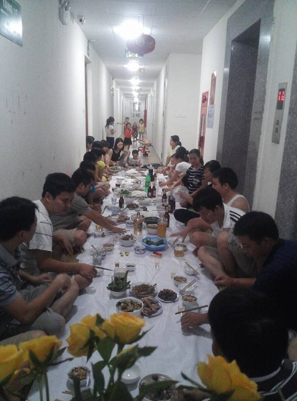 Hôm trước có bác đăng ảnh bữa tiệc hành lang chung cư ngày 20/10, cư dân rải chiếu làm tiệc, chặn cả cửa thang máy để ăn uống, hát hò. Nhiều người ủng hộ cách làm này vì nó giúp mọi người đoàn kết, thân thiết hơn. Người thì cho rằng lối sống đó ko hợp với cách sống ở thành phố.