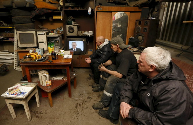 Công nhân một xưởng sửa xe ở vùng Siberia xem thông điệp của Tổng thống Putin ngày 3-12 - Ảnh: Reuters