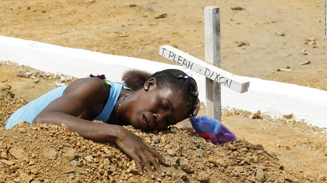 Một phụ nữ ôm nấm mồ em trai ở nghĩa trang quốc gia Liberia hôm 11/3. Nơi đây được xây dựng để chôn cất những người thiệt mạng vì nhiễm virus Ebola. Ảnh: CNN