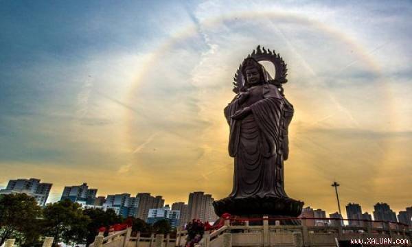 CCTV hôm 26/1 đưa tin, vầng hào quang hiếm gặp xuất hiện xung quanh bức tượng Phật giống như cầu vồng. Hào quang Mặt Trời, còn gọi là "Mặt Trời giả", là hiện tượng quang học sinh ra khi ánh sáng tương tác với tinh thể băng lơ lửng trong không khí, tạo ra vòng tròn nhiều màu sắc trên bầu trời.