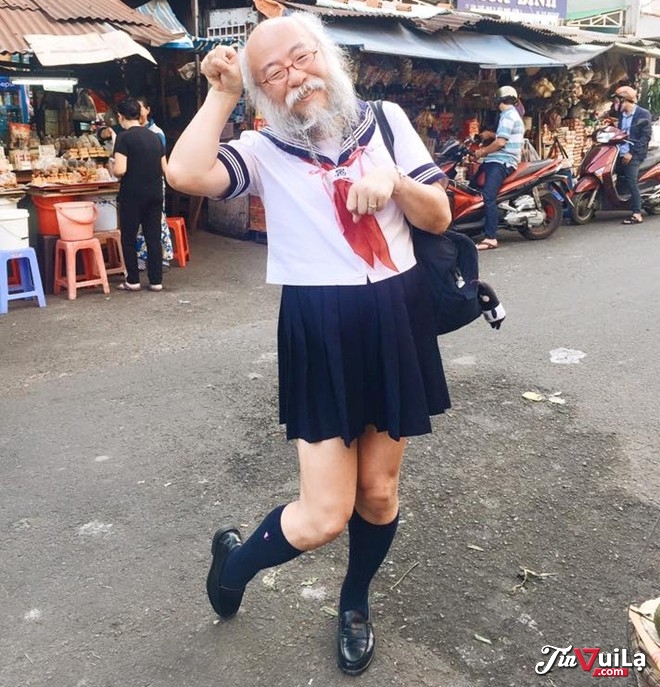 Thế nhưng sốc nhất chắc phải kể đến người đàn ông này. Không chỉ diện váy của phái đẹp ra đường, cụ ông còn “cưa sừng làm nghé” khi diện bộ váy đồng phục học sinh và tạo dáng nhí nhảnh trên đường phố. Hình ảnh của cụ ông người Nhật này được chụp tại Sài Gòn.