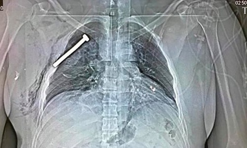Ảnh chụp X-quang của một nạn nhân cho thấy một chiếc đinh lớn nằm trong lồng ngực người này