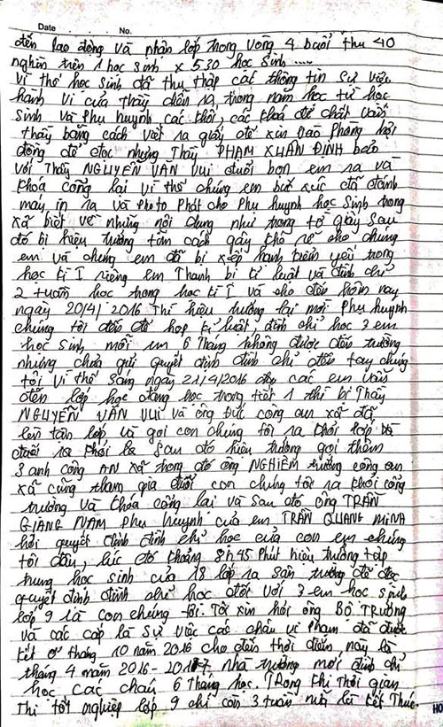 Những em này đã bị kỉ luật nghiêm khắc vì những sai phạm của mình. Tuy nhiên khi phát hiện ra hiệu trưởng làm sai thì…các em lại bị đình chỉ. Mới đây gia đình những học sinh này đã viết đơn kêu cứu bộ giáo dục khi bị đình chỉ tới 6 tháng.