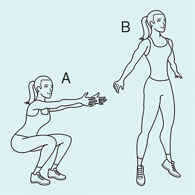 Bắt đầu Squat bật nhảy bằng cách thực hiện Squat ngồi xổm cổ điển, cánh tay hướng thẳng ra phía trước mặt bạn, lòng bàn tay hướng vào nhau.