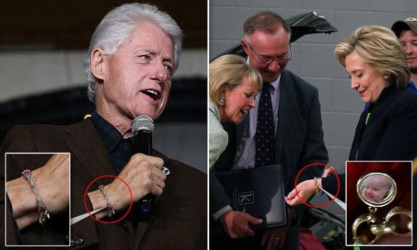 Trong khi bà Hillary luôn đeo chiếc vòng có hình Charlotte trong suốt chiến dịch tranh cử, còn chồng bà không tháo chiếc vòng đan được tặng trong hơn chục năm qua. (Ảnh: JIST.NEWS)