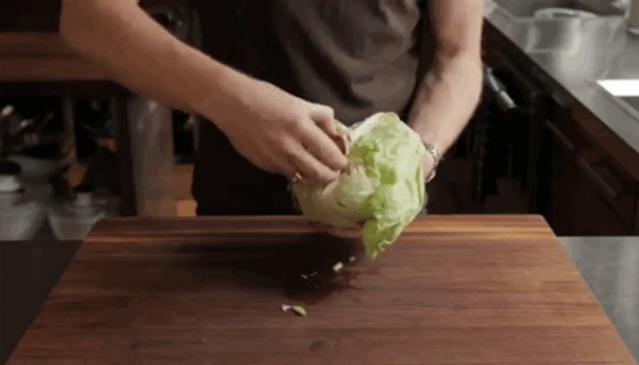 2. Cầm ngược rau xà lách hoặc bắp cải, úp xuống và đập mạnh xuống thớt là bạn có thể lấy được lõi của chúng. Lưu ý là bạn nên giữ hai tay hai bên phần lá rồi đập để tránh lá bị dập. Với cách này bạn có thể sử dụng với lá dày như bắp cải nhé.