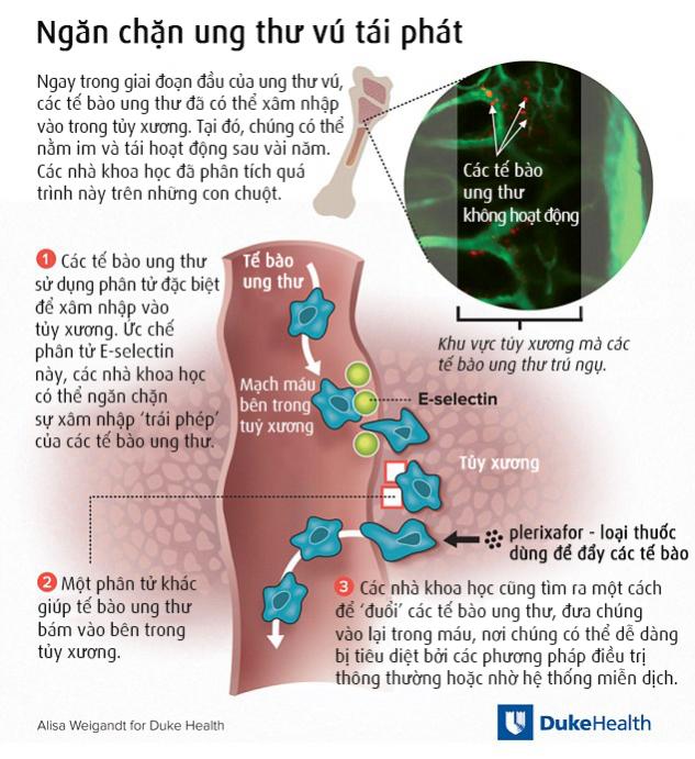 Các nhà nghiên cứu tại Đại học Duke (Mỹ) đã có thể ngăn chặn thành công quá trình xâm nhập và ẩn náu của các tế bào ung thư vú vào trong xương chuột, nơi chúng có thể sống sót qua các đợt hóa trị. Nhóm nhà khoa học cũng đã nghĩ ra một phương pháp để ‘đuổi’ các tế bào ung thư vú ra khỏi tủy xương ở chuột, khiến chúng dễ dàng bị tiêu diệt hơn bởi các phương pháp điều trị thông thường hoặc nhờ hệ thống miễn dịch. Thành công mới của các nhà khoa học hứa hẹn cho sự ra đời của một phương pháp tương tự, có thể được thử nghiệm trên cơ thể người, thắp lên hy vọng rằng một ngày nào đó, một trong những yếu tố nguy hiểm nhất của ung thư vú có thể được ngăn chặn.