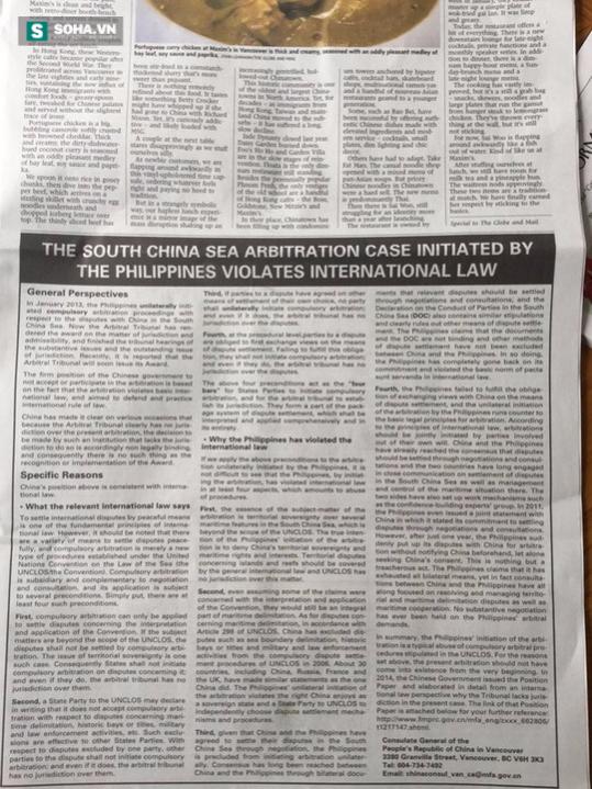 Đặc biệt, dù nằm trong phần quảng cáo nhưng nội dung bài viết này được cho là "thể hiện tiếng nói của chính phủ Trung Quốc" khi cáo buộc việc Manila khởi kiện yêu sách chủ quyền "đường chín đoạn" mà Bắc Kinh áp đặt trên biển Đông là vi phạm luật pháp quốc tế.