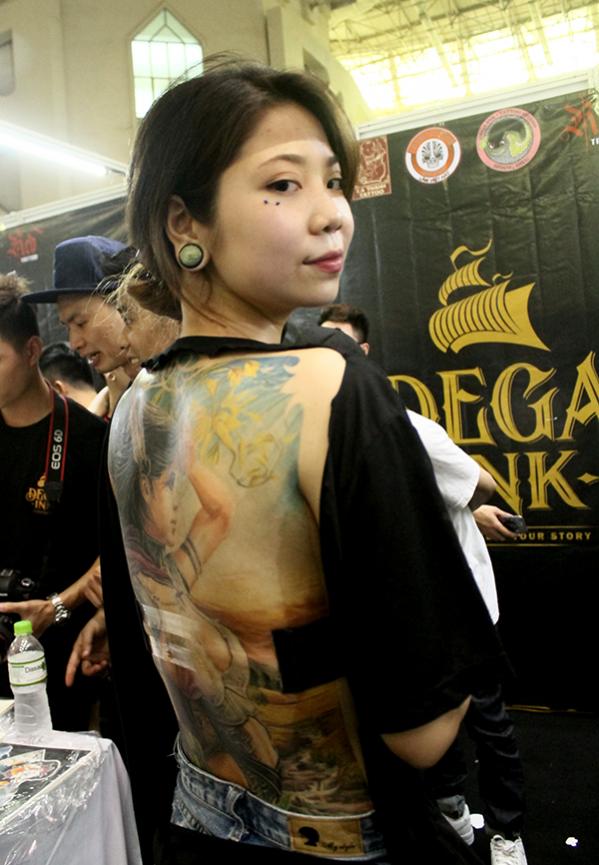 Nữ người mẫu xăm kín lưng để tham dự cuộc thi của Đại hội xăm hình quốc tế tại Hà Nội.