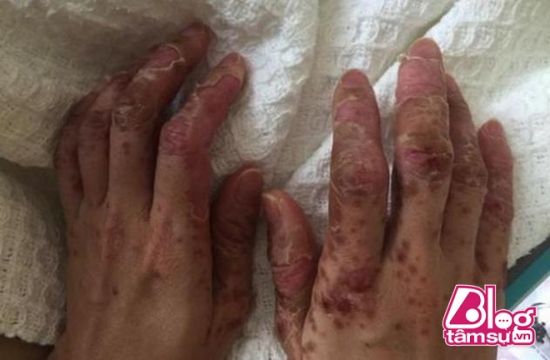 Không chỉ tay, rồi cả miệng, họng, má và chân cô đều bắt đầu xuất hiện các vết mẩn đỏ, mụn nước… Sau khi điều trị hơn 10 ngày, các vết đỏ trên tay cô đã khô lại, không loét ra như trước, các loại thuốc nhanh chóng có tác dụng giúp cô hồi phục sức khỏe .