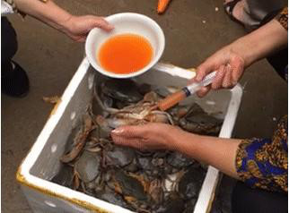 Mới đây một clip ghi lại cảnh một người phụ nữ dùng một chiếc xi lanh to, bơm một chất lỏng màu nâu vàng vào trong những con cua đã chết. Ngay sau khi được đăng trên mạng xã hội, clip khiến cứ dân mạng dậy sóng bởi hành vi vô nhân tính của những người bán hàng, thu lợi nhuận dựa trên việc tàn phá sức khỏe của cộng đồng.