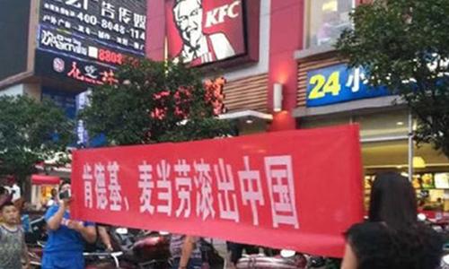 Người biểu tình Trung Quốc cầm biểu ngữ "Hãy biến khỏi Trung Quốc, KFC và McDonalds". Ảnh: Weibo