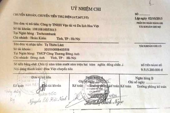 Mặt khác, đối với khoản nợ mà Công ty Hoa Việt vay của ông Long, doanh nghiệp này cho biết đã trả 9,5 tỉ đồng cho ông Tạ Thiên Long vào ngày 2.10.2015, tuy nhiên không phải gửi vào tài khoản của ông Long mà được yêu cầu chuyển vào tài khoản của Tạ Thiên Lâm. (Theo điều tra của phóng viên thì hiện ông Tạ Thiên Lâm đang nắm giữ chức vụ Thành viên HĐQT Công ty CP Vận tải ô tô số 2).