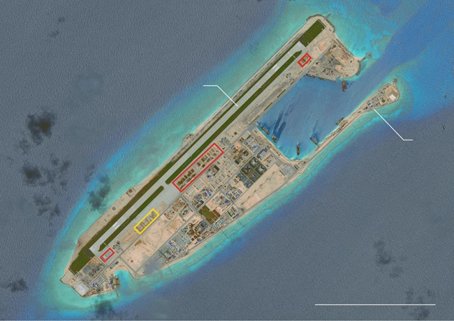 Bằng chiến lược bồi đắp phi pháp các đảo nhân tạo lớn, Trung Quốc đã thiết lập những căn cứ quân sự, căn cứ không quân và hải quân gần Philippines hay Việt Nam hơn là bờ biển của Trung Quốc. Họ tự cho quyền cấm tàu nước ngoài đi vào khu vực 12 hải lý xung quanh những rạn san hô do Bắc Kinh kiểm soát và đòi quyền hưởng vùng đặc quyền kinh tế 200 hải lý áp dụng với một lãnh thổ.