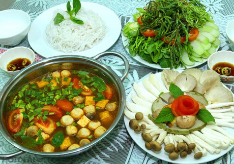 - Rau các loại rửa sạch. Cà chua bổ múi cau. Dứa thái nhỏ vừa ăn. Bắp chuối thái mỏng. Nấm hương ngâm nở. Riềng thái mỏng. Lá chanh vò nát. Sả đập dập.
