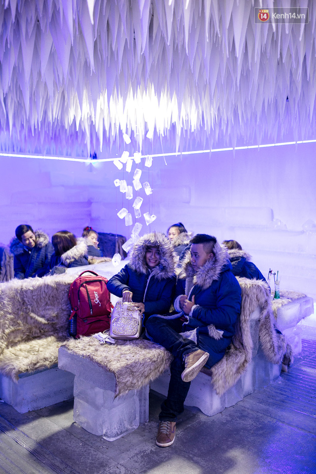 Khi vào được bên trong, bạn sẽ đi từ ngạc nhiên này đến ngạc nhiên khác khi thấy toàn bộ nội thất bên trong quán đều được làm từ băng. Thậm chí bàn ghế, quầy bar, kệ tủ, hay những chiếc đèn chùm được treo trên trần,... tất cả đều được làm từ băng. Và để giữ ấm, trên mỗi bàn và ghế đều được phủ bằng một lớp vải lông dày tạo cảm giác êm hơn khi ngồi và không cảm thấy bị khó chịu v́ quá lạnh.