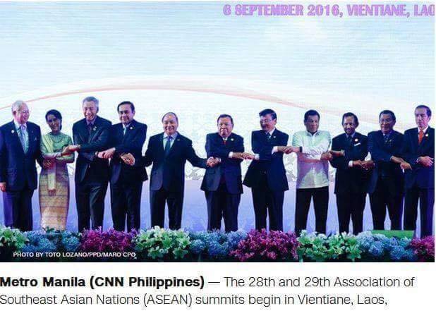 Thủ Tướng Nguyễn Xuân Phúc trước giờ nổi tiếng về nghe tiếng Anh nhầm lẫn, lần này khi người MC nói tiếng Anh mời các nguyên thủ nối tay để tỏ tình đoàn kết, ông Phúc có lẽ nghe nhầm ra đưa tay chào nên trông không giông ai, trở thành người duy nhất đưa tay lên. Từ trái: Thủ Tướng Thái, Tướng Prayuth Chano-cha, Thủ Tướng VN Nguyễn Xuân Phúc, Tổng Thống Mỹ Obama, Thủ Tướng Lào Thongloun Sisoulith, Ngoại Trưởng Philippines Perfecto Yasay và Sultan của Brunei là Hassanal Bolkiah chụp hình lưu niệm trong Thượng Đỉnh ASEAN-US ở Vientiane hôm 8/9/2016. (Photo AFP/Getty Images)