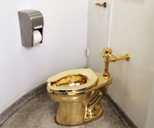 Nghệ sĩ điêu khắc Maurizio Cattelan đã tạo ra một chiếc bồn cầu đúc từ vàng ròng 18 carat và được đặt tại một nhà vệ sinh công cộng của bảo tàng Guggenheim. Đây cũng là nghệ sĩ cá tính khi đã từng thể hiện nhiều tác phẩm điêu khắc ấn tượng, gây nhiều tranh cãi.
