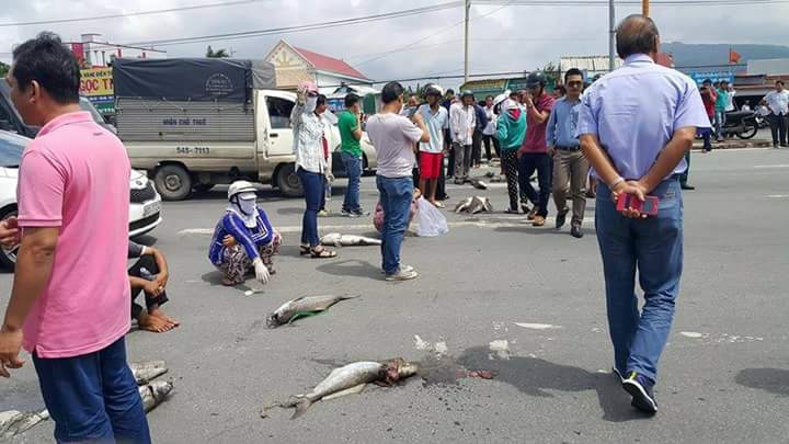 Mới đây,xảy ra hiện tượng cá chết hàng loạt tại Vũng Tàu.Quá phẫn nộ,bà con ngư dân mang số lượng cá lớn đi biểu tình.Cá được trải đầy khắp đường gây ùn tắc giao thông nghiêm trọng.