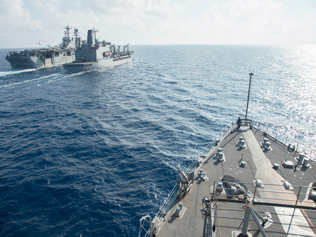 Nhóm tàu chiến Mỹ hoạt động trên Biển Đông ngày 24.10.2016. Bên trái là tàu đổ bộ USS Germantown nhận tiếp tế từ tàu dầu UNSN Walter S. Diehl, bên phải là tàu đổ bộ USS Bonhomme Richard