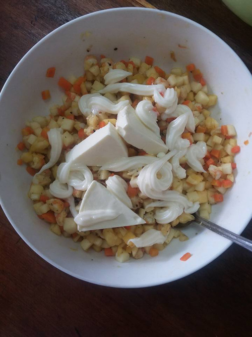 - Mayonnaise, táo, thơm, cà rốt, bánh tráng bò bía, bột chiên xù, trứng gà, tương ớt